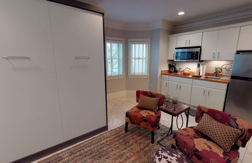 815 Whitaker is deliciously compact and cute. It fits two guests between its one bed and single bathroom. This is one of those properties with just the right amount of space for a single traveler or pair. You'll love the way this studio-style property puts everything at arm's length. The property's sleeping area features a queen-sized bed that can only be described as plush and comfortable. In addition, comfortable seating is provided. A flat-screen television is visible from the bed. The flooring inside 815 Whitaker is a new, fresh style of tile that keeps things cool during those hot Savannah nights.