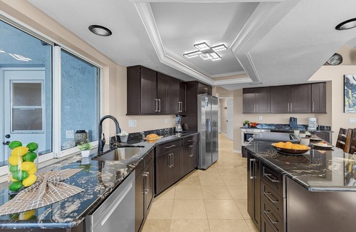 Fully Equipped Kitchen & Spacious Living Area: The gourmet kitchen boasts stainless steel appliances, granite countertops, and ample space to prepare delicious meals. The open-concept design seamlessly connects the kitchen, dining, and living areas, making it ideal for entertaining family and friends. Gather in the cozy living room with a large Smart TV for a movie night or relax with a good book while enjoying scenic water views.