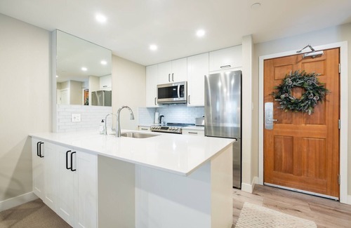 Open concept kitchen with island and state of the art appliances opens to living area with large smart TV and gas fireplace that allows you to get cozy during Winter nights. The master bedroom features a king bed, air conditioning, and newly renovated en-suite complete with shower and deep soaker tub.