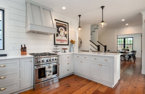 **The new kitchen is open to the living room. Custom built shaker inset cabinets, gorgeous Calacutta Gold Quartz countertops, all shiplap walls, floating reclaimed wood shelves with matte black articulating lights, new SS refrigerator, new SS dishwasher and SS gas stove. Counter seating for 3-4. Kitchen is incredibly well equipped ed with dish/glassware sets for 40 guests and everything else you would expect in a full-outfitted kitchen for large groups, and then some. Regular drip coffee maker, plus a Keurig and a new Nespresso machine. Many beautiful accent pieces from Pottery Barn and Rae Dunn round out the farmhouse look.