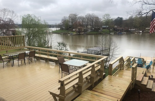 Our home features a nicely appointed kitchen with all stainless steel appliances and granite countertops. Including blender, crock pot, toaster, Keurig, coffee pot, pots/pans, bakeware and dishware. Plus plenty of different types glasses for your favorite beverage and we didn’t forget the corkscrew either! You won't even need to pack any spices, there is a spice rack with all the spices to cook up your favorite meal. We have a brand new propane grill just outside the kitchen with beautiful views of the lake while you cook! Our dining room table seats up to 6 adults, with additional eating area out on the deck both covered and uncovered - all with spectacular lake views!