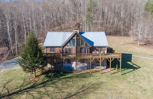 Spacious 4BR, 3 and a half bath cabin retreat with Fire pit, snuggled on 15 acres in the NC Blue Ridge Mountains. Ideal for a romantic getaway, a family vacation, corporate retreat, wedding reception etc. A log cabin that features a great room with a massive stone wood-burning fireplace that opens towards the great room and the dining room on the opposite side. Large open kitchen allows room for guests to mingle and visit during meal preparations. Spacious bedrooms with hardwood floors and exposed beams. Close to Historic Todd, walking trails by New River, Canoeing and Tubing on the New River, and lots and lots of biking trails.