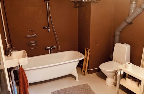 A private bathroom with a toilet, bathtub and shower is available in the adjacent house, with its own entrance. Soap, toilet paper and towels are provided.