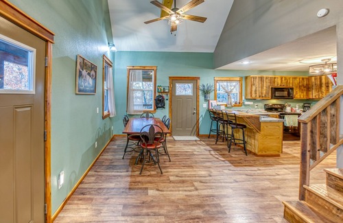 Hemmed-in-Hollow Cabin is a 1350-square-foot fully stocked cabin, built in 2022. You will have everything you need for your stay. The kitchen has everything you need to cook a meal, including spices, oil, flour, sugar, brown sugar, foil, pans, pots, skillets of varying sizes, cookie sheets, pizza pans, casserole dishes, cutting boards, knives, silverware, plates, bowls, glasses, cups and measuring cups. The grill is charcoal, and we provide one bag of charcoal, lighter fluid, lighter, and grill accessories. We provide snacks, oatmeal, hot cocoa, coffee, and tea, along with sugar, creamer, and coffee cookies. There is also plenty of paper towels, trash bags, dish soap, dishwasher tablets, toilet paper, body wash, shampoo, and conditioner to last your whole stay. If you are there just to relax there are games, books, toys, movies, hiking guides, fishing poles, fishing tackle, a cooler, outdoor games, and a fire pit provided. On the deck, there is a table, eight chairs, and a hammock.