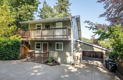 Nestled in a nice neighborhood of Laurel Hill, this renovated home is upgraded with ductless heat and air, lovely skylights, and a gorgeous view from the private deck. It’s about a 5 minute walk to beautiful Hendricks Park and is located only 1 mile from the University of Oregon and Hayward Field. There are 2 bedrooms, 2 bathrooms, a loft with office space, and a carport. The master bedroom includes a queen bed w/ master bath and a private balcony. The second bedroom includes a full bed and has a bathroom right across the hall. The loft office includes a sofa that can convert to a futon. Enjoy the breathtaking view of the hills and mountains surrounding Eugene as you grill out on the deck and relax in the lounge chairs. This home has everything you need to make a visit to Eugene comfortable and memorable!