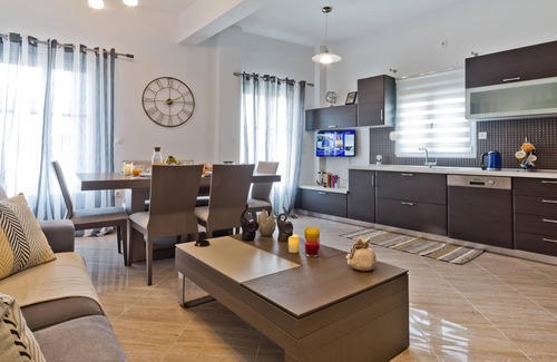 Hermes’ Getaway is spread across the first and second floors, accessible via internal and external staircases. The apartment offers three beautiful bedrooms, two furnished with comfortable double beds and one featuring two cozy single beds. Additionally, there are two bathrooms with showers for your convenience. The open-plan kitchen, accompanied by a dining and living area, is fully equipped to cater to all your meal preparation needs. Throughout the property, guests have access to a smart TV and complimentary WIFI. On the upper floor, there is a kitchenette and a separate living area, providing additional space for relaxation and leisure. Step outside to discover the beauty that awaits you—a stunning private patio adorned with outdoor furniture and BBQ facilities, perfect for enjoying a delectable meal and creating cherished memories with loved ones.