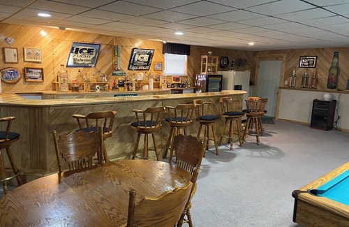 Large 5 Bedroom Log Home in a secluded wooded area, Which includes a bar and game room . Close to snowmobile and ATV trails. Heated garage perfect for snowmobilers. Large deck for stargazing. Stay with us.