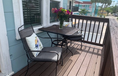 This guesthouse, located behind the owners' own beautiful home, has a prime location between beautiful Pass-a-Grille beach (< 2 blocks) and the intercoastal, just 6 blocks from historic downtown. This second floor unit is bright and airy w/ Key West vibes and a charming balcony. Beautiful wood floors throughout, a bright kitchen w/ everything you need, a comfortable and clean living space, pullout sofa and futon for extra guests and a stocked kitchen. We include beach equipment for you!