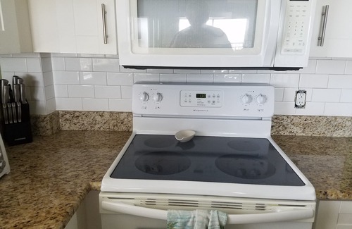 A conveniently equipped full kitchen including microwave, full size refrigerator, electric stove and dishwasher.
