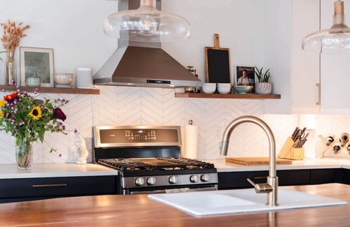 This fully equipped 2 bedroom home is bright and spacious with beautiful natural woods and boho accents.