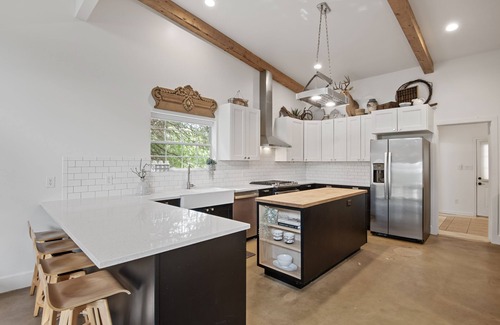 The kitchen has gorgeous quartz counter-tops and a butcher block island, tile back-splash, standard size appliances, fully stocked coffee bar, and a full house water filtration system. Cook to the view of tiny songbirds hopping through the tree cover just a few feet from the windows of the kitchen and dining room at the feeders that are available year round for them.