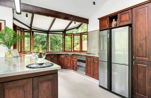 The third level, the ground, there is an additional outdoor undercover entertainment space. Enjoy a clearing of flat grassland which is encircled by untouched lowland sub tropical rainforest with trees such as native nutmeg, damson plum and mango. The rear creek boundary is the spring-fed headwaters of Chinaman’s Creek. You can even take a plunge in Slippery's waterhole.