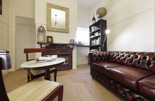 As you enter the main lounge area, you are welcomed to a cosy feel of the period furniture and decor, Accentuated by the heightened ceilings and open plan layout. There are 2 large sofas, seating up to 5 guests, with the basics you'd expect, such as a TV with access to an Apple TV for you all your streaming needs. This includes FREE WIFI. There is a split system & gas heater to help regulate the temperature throughout the year.
