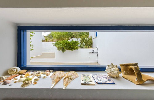 It is a private residence of 250sq m, designed by Manetas a well known Greek architect, and decorated by Stelios Anastasiadis' painting on the main atrium. It combines the principles of modern architecture with the ones of Greek traditional Aegean architecture keeping its dimensions small and human, fitting nicely with the nature of the 4000sq m land surrounding it. In the interior of the house the simple built beds and sofas create a fully functional environment for relaxed living. The out of season months provide a real escape to peace, tranquillity and relaxation.