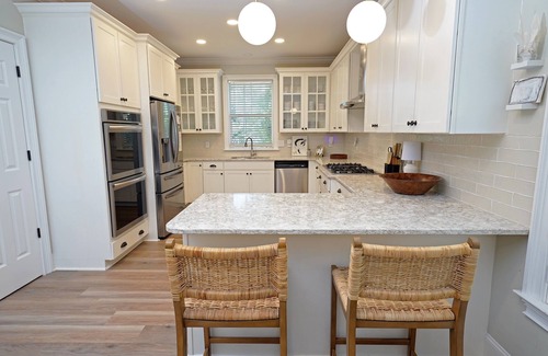 The welcoming appeal of this low country beach home is accented by a solid mahogany front door, a wide foyer invites you into the open floor plan where you find a nice size family room, dining area and a beautiful kitchen. In the kitchen, you have quartz countertops, Shaker-style white cabinets, stainless steel appliances: gas cooktop, double ovens, microwave and a new refrigerator. Kitchen is fully stocked with cookware, small appliances, and serveware to prepare and serve meals easily to your entire family.
