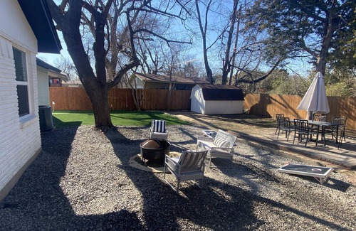 Stunning fully remodeled family friendly home. Huge fenced backyard space with putt putt, outdoor dining, charcoal grill, fire pit, and games. One story 4 bed/2 bath in SW Richardson right by Dallas, shopping, University of Texas- Dallas, and close to highway 75 for easy travel. Sip complimentary Keurig coffee while enjoying the peace and quiet and a babbling creek right behind property. Pack n play and portable high chair provided, plus toys and games for kids. Security cameras outside for safety. High speed wifi and Netflix, Amazon, and Disney+. Quiet neighborhood street with no traffic. Plenty of parking. Great for families, friends, couples, and entertaining!