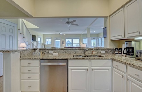Sea Star is a fabulous South Beach cottage, which would be an ideal spot for your next family vacation. Sea Star offers all the modern conveniences you'll need while vacationing on the island including new flat screen SMART televisions. This home interior blends with outdoor views of the sky and sea. Perched on a bluff in Killegray Ridge, this home is situated high enough to catch cooling ocean breezes and provide great views of the dunes of Killegray and Flora's Bluff. The spectacular Atlantic Ocean provides a relaxing backdrop for long porch visits. The beach is easily accessible by a private neighborhood boardwalk located across the street and is a mere two minute stroll away from the cottage. The first floor has a fully equipped kitchen adjoining a large living and dining room that will easily accommodate the entire family. The living area extends out to a large covered front porch, which is great for observation, conversation, and relaxation. The picnic table located on the additional back deck offers a great place for families to dine. Next to the kitchen is a bedroom suite with a queen bed and one set of bunks, a full bath and front porch. The master bedroom is located upstairs and offers a king, full bath, and a porch featuring sweeping views of the ocean, including even some glimpses of legendary Frying Pan Shoals. Down the hall from the master suite is another bedroom that includes a queen, a set of bunks, and a full bath. A Crofter Cottage is located across the back deck of the main house, next to the outdoor shower and picnic table. The Crofter Cottage offers a king bed, full bath, coffee maker and wine/beverage cooler. New in 2021 luggage racks, portable in-home doggie gate, portable in-home desk, picnic bench, gas grill arriving in March, built in beverage fridge and more. Sea Star is an excellent choice for single or multiple families. Sleeps 12 (max.). 4 bedrooms (1K-1K-1Q,1BB-1Q,BB). 4 full baths. 1 1 half bath. (1) 4 passenger cart. (1) 6 passenger cart. Pet Friendly. Saturday/Saturday. 5:30 p.m. arrival/10:30 a.m. departure.