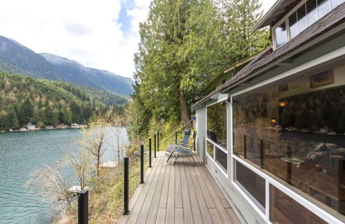 The lake side of the room is banked by windows so that you always have a view of the lake.There is a large evergreen just to the left of the view.It is a favorite roost of one of the resident eagles at Lake Sutherland.The dining table sits in front of these windows for dining with a view.There is a love seat, adjacent to the dining space, creating a wonderful place relax and enjoy a good book or just stare out onto the lake.Please note that there are caution signs on the deck railing, please no climbing or leaning on railing.