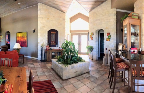 Beautiful Ranch Style Hill Country home, built on top of a hill on 10 acres, is located amongst many of the Dripping Springs wedding venues, Hamilton Pool Preserve, wineries, distilleries, the Pedernales River, and Reimers Ranch Park for swimming, fishing, kayaking, rock climbing and mountain biking! The house is a spacious open floor plan, artfully and comfortably decorated, with 4 downstairs bedrooms and a spacious loft that sleeps a total of 11-12 people. The master bedroom has a king bed, three bedrooms have queens, and the loft has a trundle bed and futon for sleeping 3 adults comfortably or 4 children. The loft is accessible by a spiral staircase. There is an expansive back porch with panoramic views of the Hill Country, great for bird watching, entertaining, watching the outdoor TV, or relaxing. There is also an outdoor shower, fire pit, bar-b-que pit and smoker. Property includes a swimming pool and hot tub, spring fed swimming hole (seasonal), and lighted sand volleyball and basketball courts. This is a prime location for popular outdoor activities in and around the Austin TX. area or hanging out all weekend at the property. The expansive kitchen makes it easy to entertain or spend family time without having to leave the property.