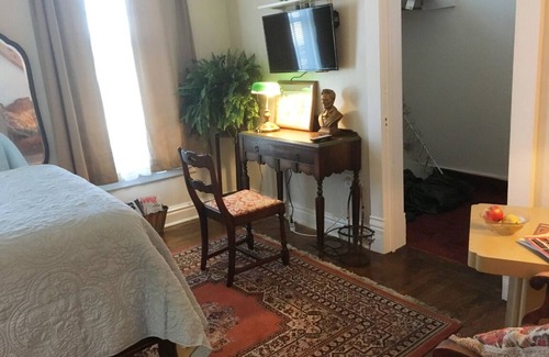Apartment 1 consists of 2 larger rooms, 1) a dining and kitchen area of 13x11 (approx) and 2) a Bedroom with Queen Bed, a sleeping alcove approx 5x8 with a twin bed and a seating area and a desk/ work area of 11x11, in addition, The bathroom with shower is off of the Dining-Kitchen area. Floors are antique hardwood and furnishings are generally vintage or antique. There is a 32" smart tv which can be used with your laptop for movies, etc. Wifi always.The kitchen is fully equipped with appliances and cookware, as well as dishes and silverware. Keurig coffee as well as tea and snacks are complementary.