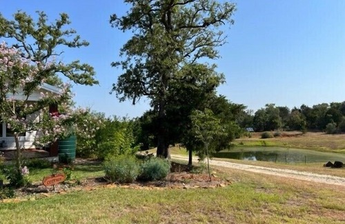Come for the view and relax in our rustic hilltop cottage! There are many bright stars at night here, and the sunsets from the back deck are amazing. We overlook the valley of the East Yegua Creek. Our cottage includes 2 bedrooms, bathroom, kitchen and laundry. The first bedroom has a queen bed, and the second bedroom has two twin beds. You can explore as much of our 30-acre property as you would like. We would be happy to give a garden tour or introduce you to some of our farm animals (chickens, ducks, cats and seasonal cows) at your request. There is a sport court with basketball and pickleball, playground, fishing in a small pond, hiking on wooded trails and a garden area. We are 45 minutes west of Bryan-College Station and Kyle Field, less than one hour north of Round Top and 90 minutes to Austin. We have our cozier cabin option for 2-3 guests available on the same property if you'd like to check it out too - search for "hilltop cabin." A 10% discount is available for weekly stays.