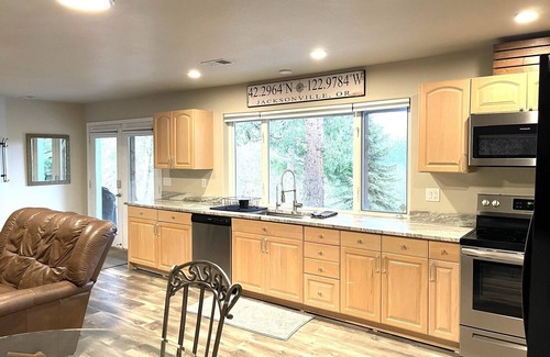 This spacious, beautifully remodeled, two bedroom, one bath home boasts a stunning view of the valley, open floor plan with the bedrooms on opposite ends, brand new kitchen with all new appliances, large laundry room equipped with folding table and iron/board, excellent wifi and a huge smart tv, and a huge covered patio with a BBQ and seating for 4, and an outdoor firepit.