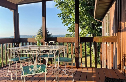 Relish the solitude of our hilltop home while you listen and view songbirds such as the Eastern Phoebe, Yellow Warbler, Cedar Waxwings and Indigo Buntings and more. The night sky is also perfect for stargazing. Located near Hallstead, this house is a dream with a spectacular panoramic view of seven mountains that fold into one another. With 3 bedrooms, including 2 queen beds and 2 twin beds, our pleasant property offers a superb stay for guests. The upstairs bathroom is equipped with a shower and bathtub, downstairs BR with a shower. You'll find all the essentials like WiFi, a washer and dryer, and AC. Our place will help you feel at home while you're traveling near Binghamton or the Endless Mountains.