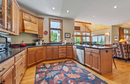 The open layout of Hilltop's main floor, combined with an impressive 700 square feet of deck space, is perfect for entertaining and gathering. Inside, guests will find a fully equipped gourmet kitchen, a dining room that seats 14, and a large stone fireplace that serves as the heart of the living area. Hilltop's beautifully designed interiors, with three master king bedrooms and spectacular views from every window, offer a casual elegance that's welcoming to all.