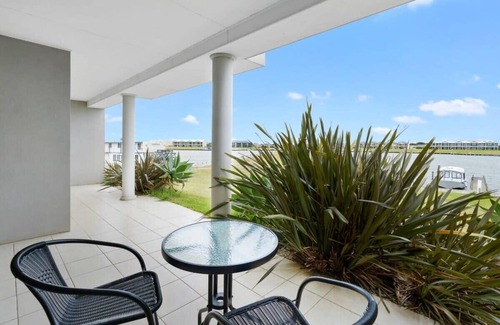 Glass sliding doors leading out onto the balcony overlooking the water with table and chairs.
