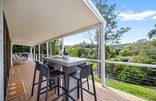 Discover this comfortable hinterland haven, nestled on 1 hectare of land, where lush greenery and Eumundi’s relaxed charm create a welcoming atmosphere. This modern 3-bedroom, 1-bath home combines comfort with style. The open-plan design, high ceilings, and large windows invite plenty of natural light, making the space feel bright and homely. With two queen bedrooms and a bunk room featuring two king-single beds, there's ample space for family or friends. You will have exclusive use of the house, which will be fully yours for the duration of your stay, complete with your own private driveway and entrance. The property provides double-filtered rainwater and a cosy fireplace for those cooler evenings. There are plenty of books, kids' toys, and activities to keep little ones occupied. Relax on the undercover deck with alfresco dining and a BBQ while taking in the scenic views. The home includes air conditioning, ceiling fans, and Wi-Fi for added convenience. Elegant finishes and thoughtfully designed spaces ensure a comfortable stay in this charming retreat.