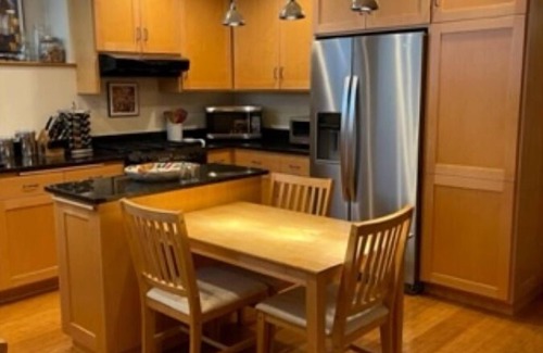 The kitchen is well fitted with a dishwasher, Dacor natural gas cooktop/electric range, microwave, toaster oven, rice cooker, coffee maker, full size fridge/freezer with ice/water, dining table that seats 4. TV & Wi-Fi included.