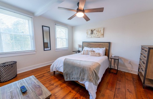 An air mattress is available for guest use in the living room. All four bedrooms feature a queen bed, a closet and/or dresser, end tables with lamps and charging ports, ceiling fans, and additional portable fans. The 4 TVs will be equipped with Roku Guest Mode coming Spring '24, meaning you can sign in to all of your own streaming services at check-in, and you'll be automatically logged out of all your accounts on the day of check-out. You'll access the home at check-in using a coded deadbolt and a 4-digit code supplied the morning of check-in.