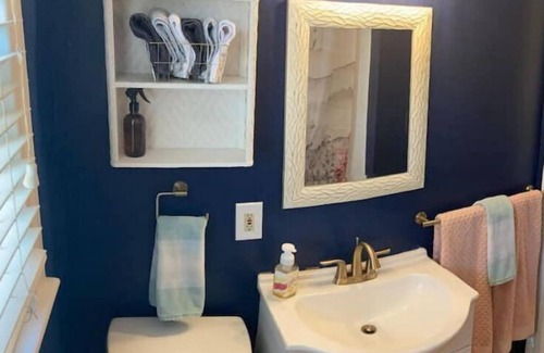 This cute house has more than meets the eye. A spacious front porch with two vintage style rockers and a table to enjoy a cup of coffee in the morning, with a secluded private backyard at night. This allows you to enjoy a gorgeous custom built fire pit, charcoal and gas grill (gas provided), and large outdoor entertaining area. Drinks, bbq, fire, and s’mores 🙂. (Bring your own firewood). Outside dining table for 4, and adorandack chairs around the fire pit for 4.