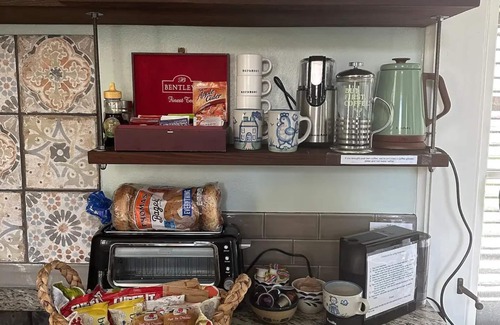 The bedroom is extra comfy with a queen adjustable bed and memory foam mattress. There is also a twin bed in the same room. Extra pillows and blankets in the closet. A walk-in closet provides plenty of space for hang-up clothes and suitcase. The antique furnishings and Victorian lamp feel like “home.” The triple-baffle blinds and to-the-floor curtains make this room snuggly; they can block out all light or let the light flood in! The sound of the fountain outside can be heard when all is quiet. The TV streams Sling TV, Amazon Prime, Brit Box, Masterpiece Theater and various other channels for after a long day of touring.