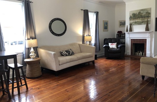 The historic property is located in the heart of downtown Mobile, Alabama. 1 block from Mardi Gras parade route and Civic Center. Walking distance to shops, dining and pubs. The home has two large bedrooms with queen beds, two full bathrooms, updated full kitchen, laundry and large spacious living room with two comfy sofas, recliner and a pub table. one bedroom and bath is downstairs and the other bedroom and bath is upstairs.