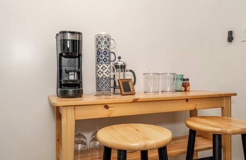 Further inside, the home’s kitchen is fully equipped with stainless steel appliances, gorgeous wood countertops, cookware, a coffee bar with 2 barstools, and a formal dining table set for 4. The home’s bathroom is just off the kitchen with a spacious, walk-in shower.