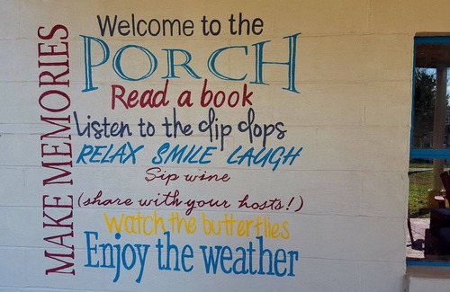 Enjoy the outside as well - there is plenty of room for gathering in the covered porch. You'll find lots of seating and a hammock. You are also welcome to use the adjoining firepit area that belongs to The Arti'st's Inn - our bed and breakfast.