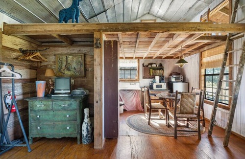 This is a basic, efficiency-style cabin with an open floor plan combining a sleeping area, dining nook, and kitchenette, plus a bathroom with a shower. There’s also a small loft accessible by a stairwell. The amenities are minimal but sufficient, giving you a straightforward experience of a rustic country lifestyle.
