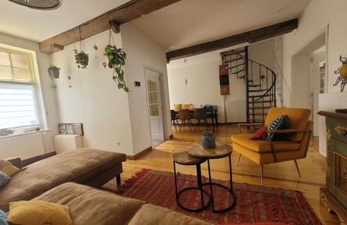 Als u binnenkomt treft een u een ruime living een eetplaats met een knipoog naar het historisch pand.