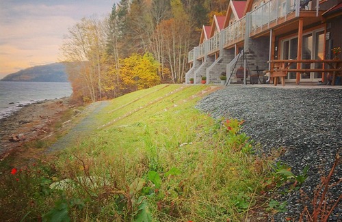 The holiday homes at Hjellup Fjordbo have a fantastic location right at the bottom of the beach. The houses are brand new and ready for rent from May 2018. Each apartment has a living room and kitchen with large glass surfaces and sliding doors that can be opened to the south. Here you can enjoy the view and proximity to the sea, take walks along one of the many hiking trails in the area, rent a bike and go exploring, experience proximity to agriculture and animals or just enjoy quiet days with barbecue in the shoreline, tidal waves and good experiences.