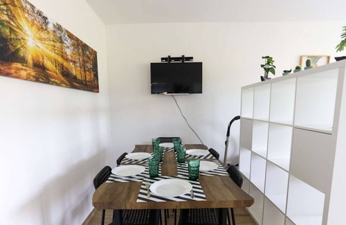 HÖ01 large apartment with dryer and washing machine is located in Busingen am Hochrhein. HÖ01 large apartment with dryer and washing machine provides accommodation, featuring TV, Bedding/Linens, Kitchen, among other amenities. This Apartment features TV, Bedding/Linens, Kitchen, to make your stay a comfortable one.