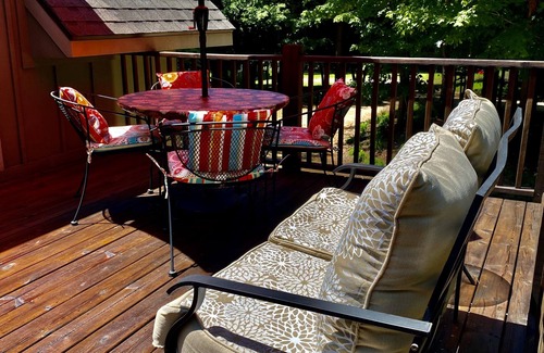 Enjoy relaxing on the deck amongust the trees , or in the hot tub while listening to the wild life and seeing beautiful sunsets. Are carriage home is on 12 acres, we have chickens, a pair of ducks and two peacocks.(can be loud during mating season)