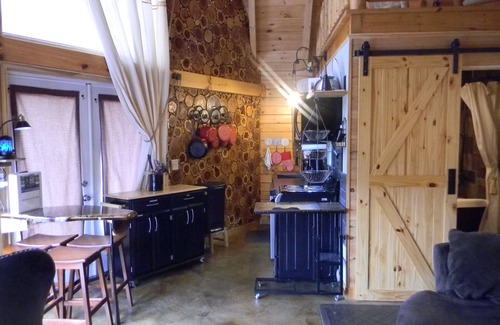The cabin is complete with a fully equipped galley-style kitchen, stained concrete flooring throughout the first floor, sliding patio doors along with two sets of functional French doors with a third French door set as a backdrop for the suspended log bed. The reading area in the loft features Amish-built rockers from which you can watch the sunsets and a queen log bed.
