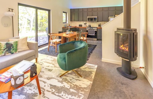 The cabin’s primary bedroom is off the living area, which has a queen bed. The upstairs loft area has two twin beds and an office space with a sit/stand desk. The kitchen is a cook’s delight, with gas range, ample counter space, tons of cabinets, and a full range of appliances and utensils. The living & dining area is anchored by a gas fireplace - in cooler temperatures, nothing beats gazing out the wall of windows while enjoying the warmth of the fire. The cabin’s bathroom is equally charming & modern, with a bathtub and rain shower.