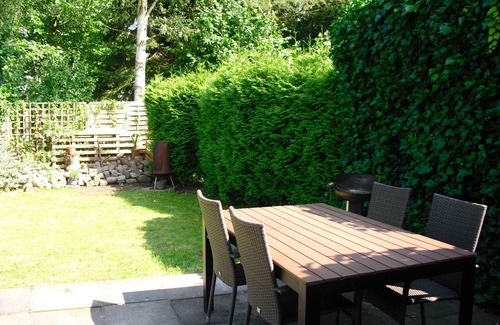 Outside there is a terrace with seating and a small stone garden, surrounded by many trees and shrubs.
