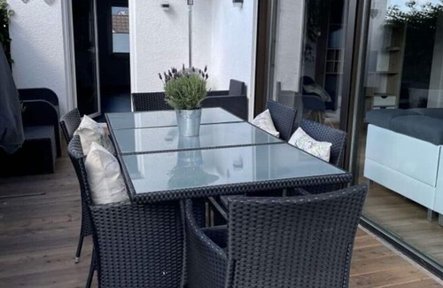 The approximately 170 m² holiday apartment with a separate entrance can be used by 2 to 5 overnight guests; dogs are allowed. Large entrance area with hallway and table football and work area. 40 m² living room with couch (with sleep function), TV, play area for the children, direct access to the terrace and garden. Open kitchen that leaves nothing to be desired, dining room with access to the terrace that invites you to relax and grill. The garden is fenced all around, has a play area with a very large sandpit, and there is also space for the four-legged friends. Parking spaces are directly in front of the holiday apartment and storage space for bicycles is also available.