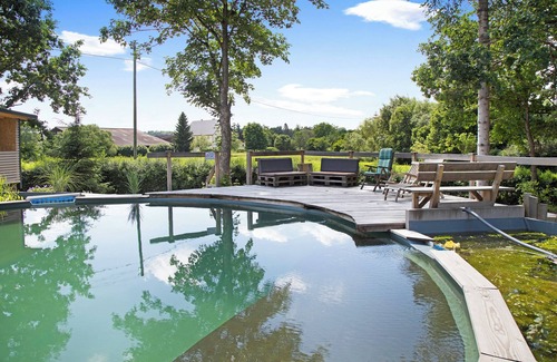 Between the Danube River and Lake Constance, the 100 m² apartment Donautal is located in the town of Meßkirch and impresses guests with its modern decor and beautiful, green surroundings. The modern apartment consists of a spacious, sunny living/dining room with a large sofa bed for 2 people, an open, well-equipped kitchen with a dishwasher, 2 bedrooms as well as 2 bathrooms (both with a shower and a WC) and can therefore accommodate from 4-6 people. Additional amenities include Wi-Fi, a television, a washing machine, a dryer and a hair dryer. A baby bed, a highchair and children’s books and toys as well as a playground on the property make this accommodation particularly child-friendly. Furthermore, the apartment boasts a private balcony (45 m2), which is accessible from all rooms, with a cosy lounge corner as well as a dining table and a grill. In the beautiful shared garden you will find a swimming pond where you cool down and unwind at the end of the day. From the kitchen you have a view of Werenwag castle in Donautal, giving you a first taste of the Upper Danube Nature Park.