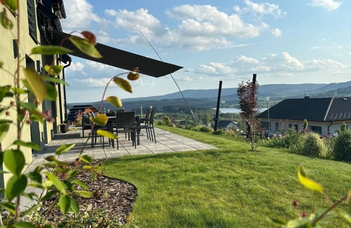 Outside, the chalet's allure continues with a large terrace offering breathtaking views of Lipno Lake and the lush Šumava landscape. The garden, a vast expanse perfect for disconnecting from the digital world and reconnecting with nature. Whether it's basking in the serene atmosphere or enjoying a moment of tranquility in the spa house (available for an additional payment), which features a Finnish sauna for 4 people and a large hot tub for 6, the outdoor offerings make every stay magical.