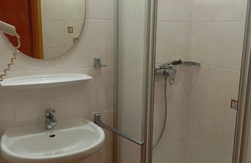 The holiday flat is located on the first floor of a guesthouse, which also offers guest rooms in addition to the flat. Measuring 20 square metres, it has a separate kitchen, a bedroom with a double bed and a bathroom with a shower. Thanks to its central location, all the main shops, from the butcher to the supermarket, are just a five-minute walk away. The railway station is also a five-minute walk away, and there is a bus stop right outside the house. The 15 square metre kitchen is equipped with a two-ring hob and a microwave. WLAN and satellite TV are also available.