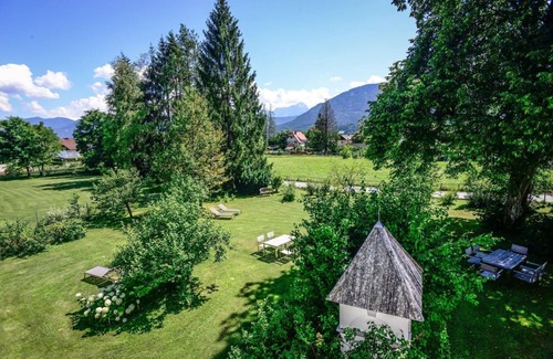 You can have breakfast in the stylish garden next to the beautiful piety column, with a view of the local mountain Dobratsch, after buying bread at the organic bakery opposite. There are quality loungers and seating in the garden for every guest. You can also enjoy a grill evening. You can refresh yourself at the spring in front of the villa with clear mountain water, or fill your drinking bottle for your next cycle tour. You can hire bicycles at the fitness centre about 100 metres away. There are bicycle stands or a lockable room for your bicycles. You can park your car on site in front of the villa and in winter you can store skis and boots in the cellar.